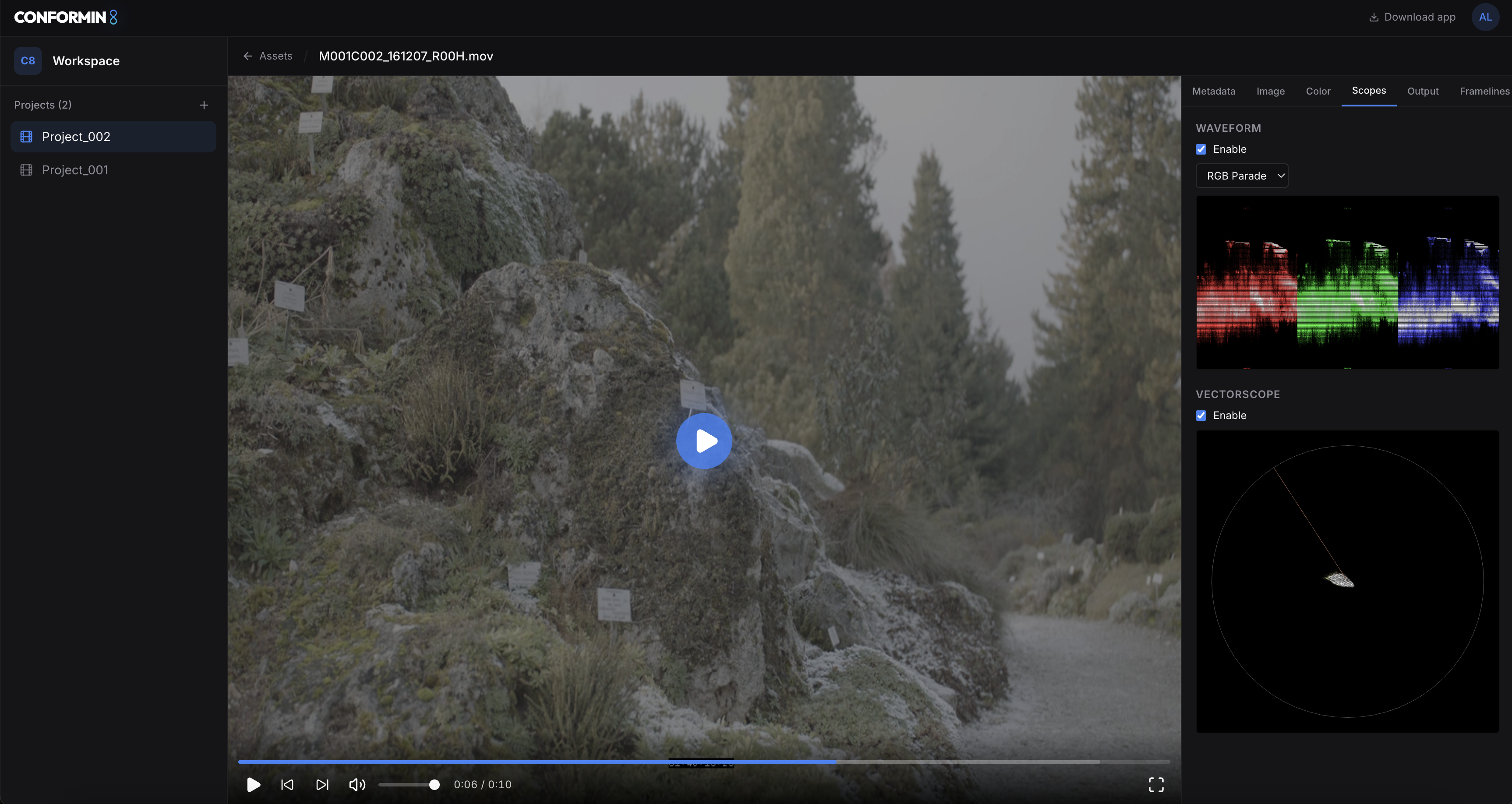GPU-accelerated WebGL shaders for channel isolation, focus assist, false color, clipping detection, waveform, vectorscope, and 3D LUT engine — all at full frame rate in the browser.